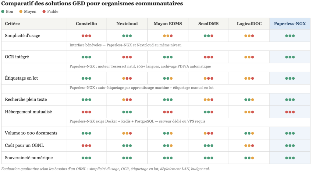 Paperless-NGX se démarque sur exactement les trois critères que vous avez retenus :